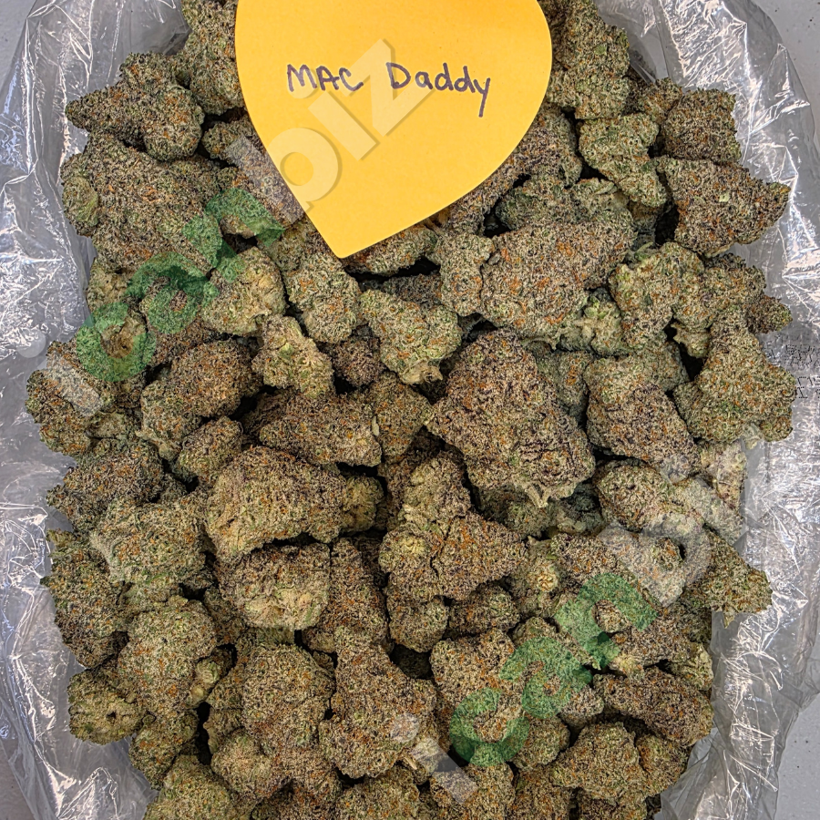 Mac Daddy doesn’t just sit in a jar, it steals the spotlight. Dense, frosty nugs flash deep greens, bold purples, and electric orange pistils, glistening like a glacier. The aroma is a decadent mix of kush cream and sharp gas, delivering on every spark of the lighter.